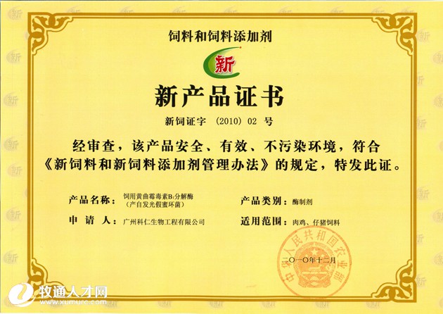 公司已經(jīng)成功開發(fā)出以黃曲霉毒素B1分解酶為有效成分的飼料添加劑新產(chǎn)品——飼用黃曲霉毒素B1分解酶。該產(chǎn)品已經(jīng)獲得農(nóng)業(yè)部頒發(fā)的新產(chǎn)品證書,是目前國內(nèi)外唯一一個(gè)準(zhǔn)許使用的,以生物酶法進(jìn)行飼料中黃曲霉毒素B1去除的產(chǎn)品。產(chǎn)品的核心技術(shù)在全球21個(gè)國家和地區(qū)申請了專利保護(hù),是一個(gè)具有完全自主知識產(chǎn)權(quán)的,達(dá)到國際先進(jìn)水平的新產(chǎn)品。核心技術(shù)專利在全國第17屆發(fā)明專利博覽會上獲得銀獎。該專利產(chǎn)品榮獲中2011年“中國飼料重大技術(shù)進(jìn)步項(xiàng)目獎”。
