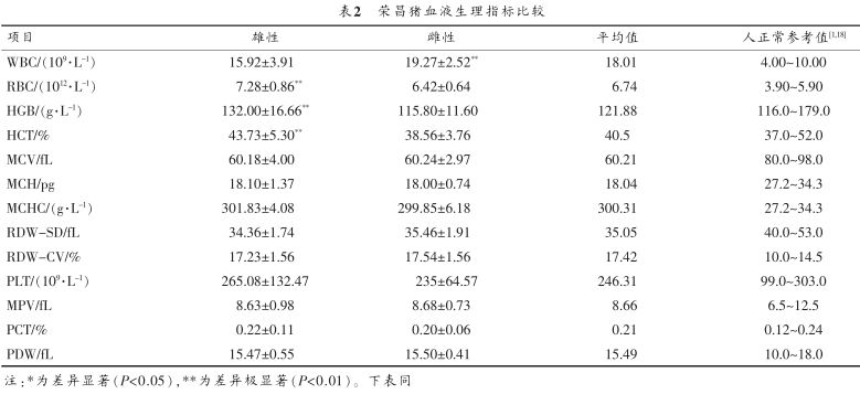 由表2可知,榮昌公豬的RBC、HGB、HCT均高于榮昌母豬(P<0.01),而WBC正好相反(P<0.01)。榮昌豬其他生理指標(biāo)在性別間無顯著差異(P>0.05)。