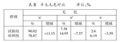 (4)導(dǎo)入后羊毛品質(zhì)改良效果。導(dǎo)入后羊毛細(xì)度變細(xì)了,但基本上還是保持在25.1~40.0um(46~58支紗)的半細(xì)毛范圍內(nèi)。試驗(yàn)組純白率達(dá)到90.02%,比對(duì)照組增加了11.15%;體白率為7.38%,比對(duì)照組減少了7.57%;花雜率為2.6%,比對(duì)照組減少了3.59%。試驗(yàn)組羊毛強(qiáng)度比對(duì)照組高0.41CN/dtex。