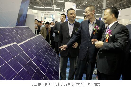 開幕式結(jié)束后,高鴻賓會(huì)長等一行領(lǐng)導(dǎo)在劉主席的陪同下到通威展臺(tái)參觀,劉主席向高會(huì)長詳細(xì)地介紹了通威“漁光一體”創(chuàng)新模式。通威“漁光一體”項(xiàng)目以光伏發(fā)電站為主,漁業(yè)養(yǎng)殖為輔,結(jié)合通威365健康養(yǎng)殖模式,拓展了通威太陽能光伏技術(shù)應(yīng)用領(lǐng)域,通過“水上產(chǎn)出清潔能源、水下生產(chǎn)安全通威魚”,達(dá)到光伏發(fā)電與漁業(yè)養(yǎng)殖的一體化有機(jī)結(jié)合,實(shí)現(xiàn)了“魚、電、環(huán)?!比S收。
