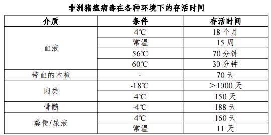 非洲豬瘟病毒對(duì)環(huán)境耐受力強(qiáng),病毒在肉品、血液、組織、糞便,以及養(yǎng)殖場(chǎng)、市場(chǎng)、屠宰場(chǎng)、車輛等環(huán)境中可長(zhǎng)時(shí)間存活。病毒存活時(shí)間與所處介質(zhì)、溫度和濕度等因素密切相關(guān),詳見下表。