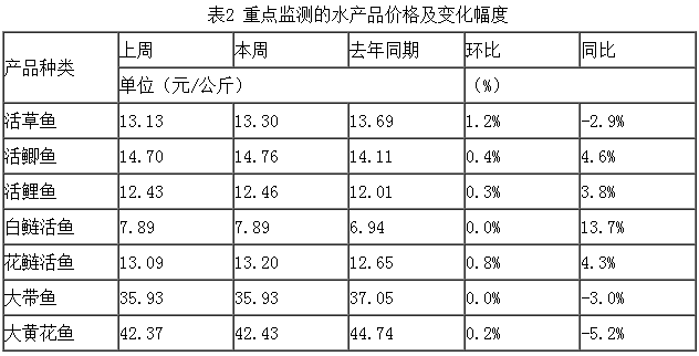 上周,重點(diǎn)監(jiān)測(cè)的水產(chǎn)品草魚、鯽魚、鯉魚、白鰱魚、花鰱魚、大帶魚和大黃花魚與上周相比,變化幅度在0~1.2%之間。