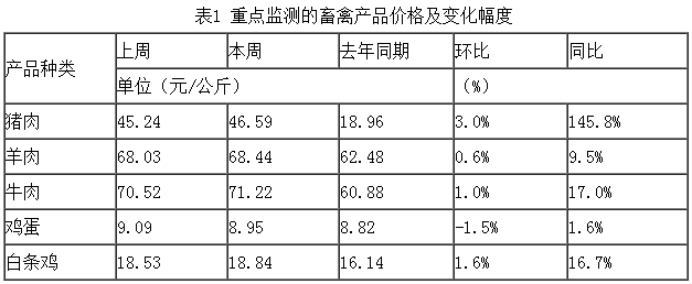 上周重點(diǎn)監(jiān)測(cè)的畜禽產(chǎn)品豬肉、羊肉、牛肉、雞蛋和白條雞與上周相比,變化幅度在-1.5~3.0%之間。