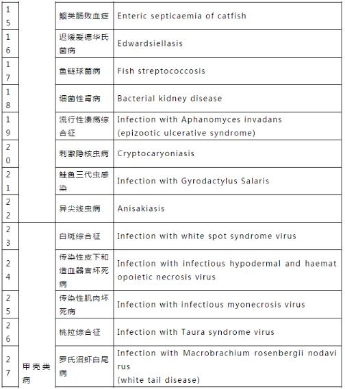 修訂后的《名錄》,包括水生動物疫病43種,均被列為二類進境疫病。新增了7種水生動物疫病,分別為:鮭魚甲病毒感染、鯉浮腫病毒病、羅非魚湖病毒病、細(xì)菌性腎病、急性肝胰腺壞死、十足目虹彩病毒1感染(蝦虹彩病毒?。┖拖旙⒒【腥?;刪除了8種水生動物疫病,分別為:對蝦桿狀病毒病、斑節(jié)對蝦桿狀病毒病、小瓜蟲病、黏孢子蟲病、 指環(huán)蟲病、河蟹顫抖病 、鮑膿皰病和鱉腮腺炎病。
