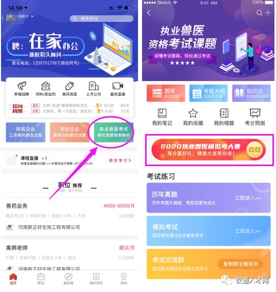 3、打開牧通人才網(wǎng)APP,點擊執(zhí)業(yè)獸醫(yī)考試模塊,進入“2020執(zhí)業(yè)獸醫(yī)模擬考大賽”開始考試,即可參加活動。