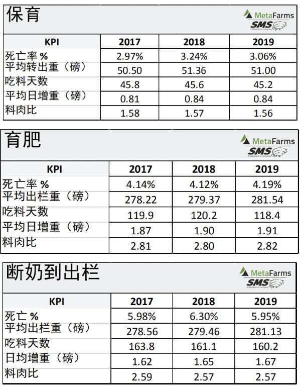 該報(bào)告由美國養(yǎng)豬數(shù)據(jù)公司MetaFarms及子公司SMS具體制作,所用數(shù)據(jù)為其系統(tǒng)中至少建檔3年以上的美國豬場的數(shù)據(jù),2019年該數(shù)據(jù)集涵蓋母豬場600個(gè),母豬1,588,246頭,保育豬15,666,136頭,育肥豬17,479,763頭,斷奶到育肥豬8,023,610頭。