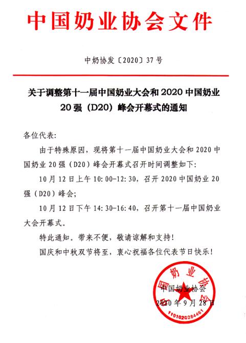 關(guān)于調(diào)整第十一屆中國(guó)奶業(yè)大會(huì)和2020中國(guó)奶業(yè)20強(qiáng)(D20)峰會(huì)開幕式的通知