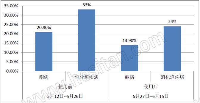 通過表3最終表現(xiàn)出變化比較明顯的是飼喂量,產(chǎn)后食欲好采食量提升,消化道疾病和代謝病就會減少。產(chǎn)后盡快恢復(fù)食欲、提升采食量是最有效的產(chǎn)后恢復(fù)方式。產(chǎn)后酮病作為營養(yǎng)代謝病,產(chǎn)后發(fā)病較高,以下是使用前后的產(chǎn)后酮病發(fā)病率。