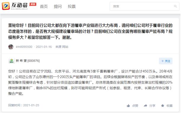 1月25日,新希望在回復(fù)投資者提問(wèn)時(shí)表示,公司目前在遼寧沈陽(yáng)、北京平谷、河北南宮有3家千喜鶴屠宰廠,設(shè)計(jì)產(chǎn)能合計(jì)450萬(wàn)頭。20年4月初,公司還公告了山東德州的一個(gè)200萬(wàn)頭產(chǎn)能屠宰廠的項(xiàng)目。后續(xù)會(huì)根據(jù)豬場(chǎng)投產(chǎn)的節(jié)奏,以及單場(chǎng)或所在聚落整體規(guī)模綜合考慮,針對(duì)部分項(xiàng)目追加建設(shè)屠宰廠。