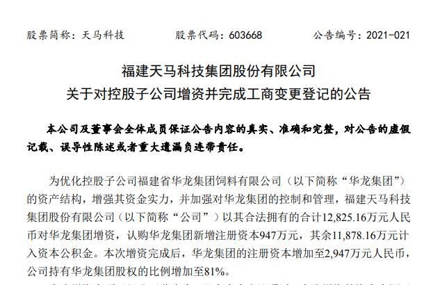天馬科技2月19日發(fā)布公告,為優(yōu)化控股子公司福建省華龍集團(tuán)飼料有限公司(以下簡(jiǎn)稱“華龍集團(tuán)”)的資產(chǎn)結(jié)構(gòu),增強(qiáng)其資金實(shí)力,并加強(qiáng)對(duì)華龍集團(tuán)的控制和管理,福建天馬科技集團(tuán)股份有限公司(以下簡(jiǎn)稱“公司”)以其合法擁有的合計(jì)12,825.16萬元人民幣對(duì)華龍集團(tuán)增資,認(rèn)購(gòu)華龍集團(tuán)新增注冊(cè)資本947萬元,其余11,878.16萬元計(jì)入資本公積金。
