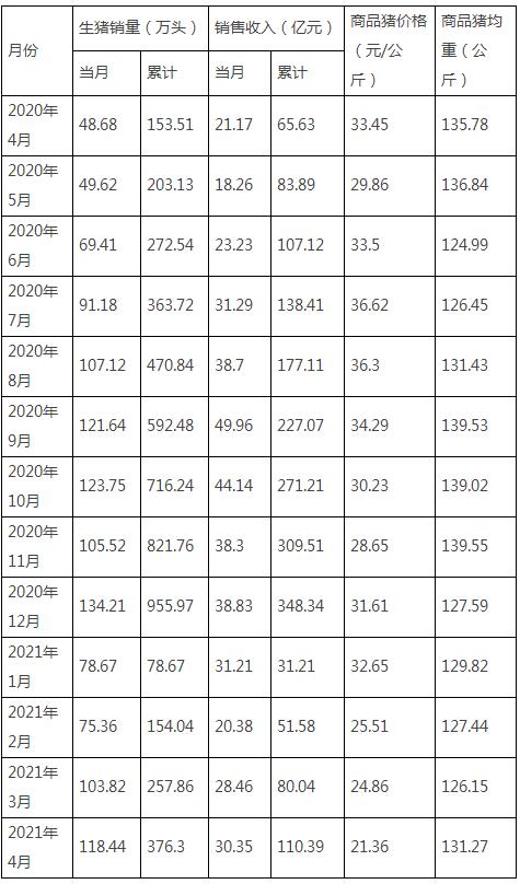 2021年1-4月,公司累計銷售生豬376.30萬頭,同比上升145.13%;累計銷售收入110.39億元,同比增長68.19%。