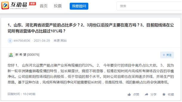新希望近日在回復投資者提問時表示,山東河北運營產能占豬產業(yè)所有規(guī)模的約20%;今年要交付的項目中南方占比大些。