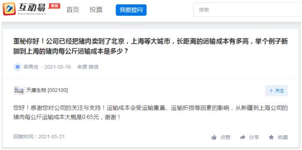 天康生物:從新疆到上海的豬肉每公斤運(yùn)輸成本大概是0.65元
