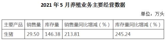 2021年5月末,公司生豬存欄146.38萬(wàn)頭,較2020年5月末增長(zhǎng)245.24%,較2020年12月末增長(zhǎng)51.87%。