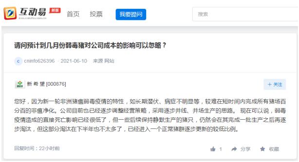 新希望近日在回復投資者提問時表示,因為新一輪非洲豬瘟弱毒疫情的特性,如長期潛伏、病癥不明顯等,較難在短時間內完成所有豬場百分百的非瘟凈化。公司目前也已經逐步調整經營策略,采用逐步并線、并場生產的思路。