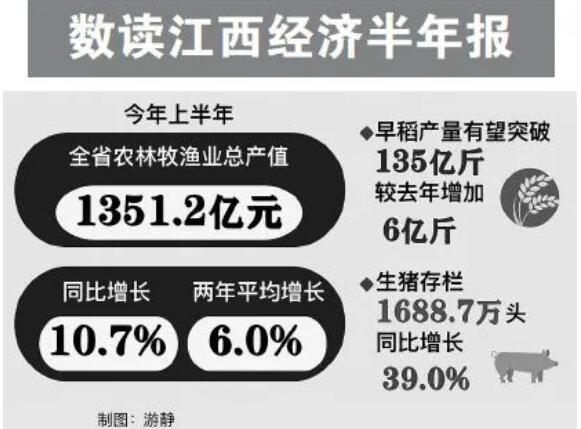 今年上半年,江西農(nóng)業(yè)生產(chǎn)基本面向好,產(chǎn)業(yè)發(fā)展質(zhì)效不斷提升,要素支撐保障持續(xù)增強,呈現(xiàn)出“穩(wěn)中提質(zhì)、接續(xù)向好”的發(fā)展態(tài)勢,農(nóng)林牧漁業(yè)總產(chǎn)值1351.2億元,同比增長10.7%。