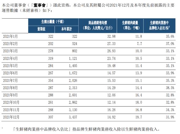 中糧家佳康1月10日公布2021年12月運營快報。公司12月生豬出欄量30.7萬頭,本年累計生豬出欄量343.7萬頭;商品豬銷售均價人民幣14.92元/公斤,生鮮豬肉銷量1.97萬噸,生鮮豬肉業(yè)務(wù)中品牌收入占比為31.9%。