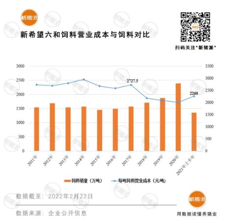 得益于強(qiáng)勁的采購力,新希望六和飼料成本總體控制較好。2017年-2021年上半年,其每噸飼料營業(yè)成本隨著飼料銷量上漲,反而總體呈下降趨勢。