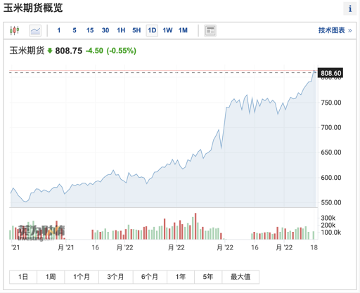 受此影響,糧食大宗商品價格再度大漲。美國時間周一,美國CBOT 7月玉米期貨大漲2.8%,突破每蒲式耳8美元,創(chuàng)2012年9月以來的近十年新高,較年初的6美元上漲1/3。
