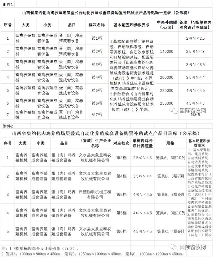 5月13日,山西省農(nóng)業(yè)機械發(fā)展中心發(fā)布《山西省集約化肉雞養(yǎng)殖場層疊式自動化養(yǎng)殖成套設(shè)備購置補貼試點產(chǎn)品補貼額一覽表和目錄庫》公示稱,山西省擬開展肉雞養(yǎng)殖成套設(shè)備購置補貼試點工作,現(xiàn)制訂了《山西省集約化肉雞養(yǎng)殖場層疊式自動化養(yǎng)殖成套設(shè)備購置補貼試點產(chǎn)品機具補貼額一覽表》(附件1),并建立了《山西省集約化肉雞養(yǎng)殖場層疊式自動化養(yǎng)殖成套設(shè)備購置補貼試點產(chǎn)品目錄庫》(附件2),現(xiàn)予公示,其中補貼額一覽表中第1、3、7檔中央財政補貼額待征集到符合要求的產(chǎn)品后,再測算公示。