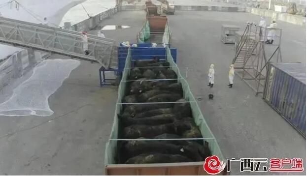 當(dāng)天上午9時(shí),該批種牛抵達(dá)欽州港碼頭,消殺、檢驗(yàn)、消毒……經(jīng)過海關(guān)、檢驗(yàn)檢疫部門4個(gè)小時(shí)不間斷的現(xiàn)場接卸監(jiān)管作業(yè),1.4萬頭經(jīng)口岸檢疫合格的新西蘭種牛開始裝運(yùn)貨車。為確保運(yùn)輸過程的安全有效,這批種牛由120名專業(yè)司機(jī)、100輛重型運(yùn)輸車輛負(fù)責(zé)運(yùn)輸,全程閉環(huán)管理,直至車輛抵達(dá)龍州。