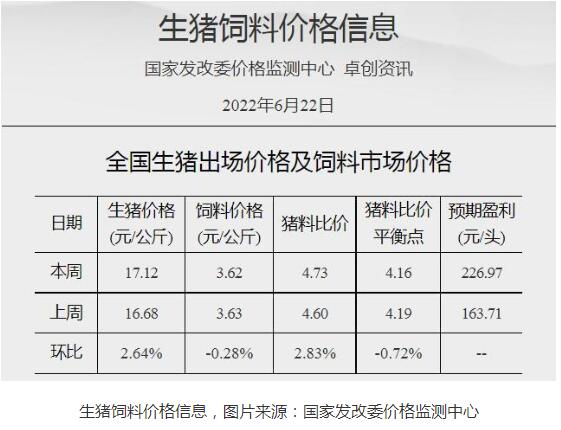 國家發(fā)改委價格監(jiān)測中心網(wǎng)站27日公布2022年6月第4周豬料、雞料、蛋料比價。截至2022年6月22日當(dāng)周,全國豬料比價為4.73,環(huán)比漲幅2.83%。按目前價格及成本推算,未來生豬養(yǎng)殖頭均盈利為226.97元。國內(nèi)豬價以漲為主。
