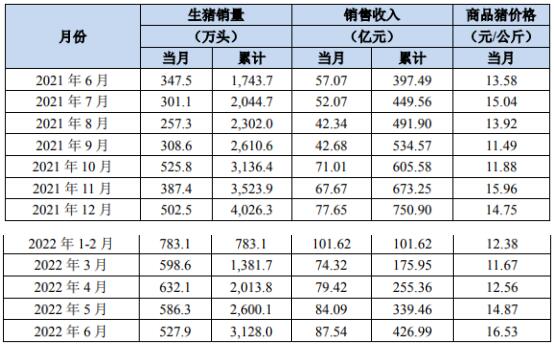 2022年上半年,公司共銷售生豬3,128.0萬(wàn)頭,其中商品豬2,697.7萬(wàn)頭,仔豬409.3萬(wàn)頭,種豬21.1萬(wàn)頭。