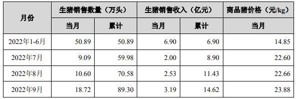 2022年9月,公司銷售生豬18.72萬頭(其中仔豬5.41萬頭),銷售收入3.19億元;商品豬銷售均價23.88元/kg。