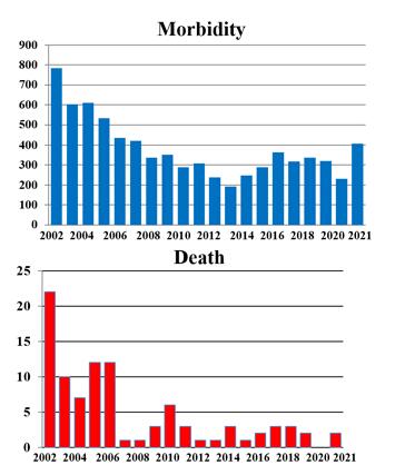 根據(jù)《獸醫(yī)公報》,最近17年我國共計報告疫情305起,主要集中在西北、華北、東北、西南等農(nóng)牧業(yè)發(fā)達地區(qū)。統(tǒng)計發(fā)病動物2770頭,以牛和綿羊為主,死亡1954頭,死亡率70.5%。