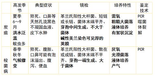 下表展示了炭疽和梭菌病的鑒別診斷,這兩種疾病的發(fā)病動物都有突發(fā)死亡、天然孔出血和腹部膨脹等類似的臨床癥狀。