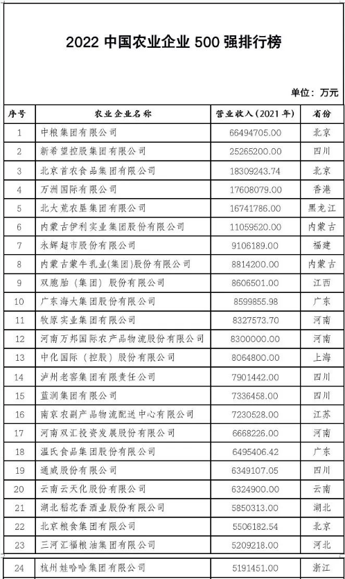 農(nóng)民日?qǐng)?bào)社12月15日公布了《2022中國(guó)農(nóng)業(yè)企業(yè)500強(qiáng)》榜單,新希望、牧原、溫氏、海大、雙胞胎等農(nóng)牧企業(yè)上榜。