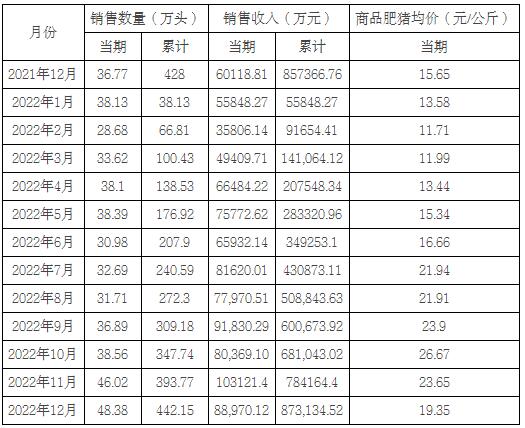 2022年1-12月銷售商品豬442.15萬頭(其中仔豬銷售64.16萬頭),銷售收入873,134.52萬元,銷售均價18.35元/公斤(商品肥豬均價為18.10元/公斤),同比變動分別為3.31%、1.84%、-0.17%。