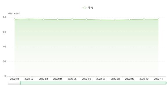 目前牛肉行業(yè)的市場(chǎng)顯現(xiàn)出一個(gè)很奇怪的現(xiàn)象,牛肉的價(jià)格變動(dòng)并不像市場(chǎng)上表現(xiàn)的那么大,雖然業(yè)內(nèi)有肥牛滯銷的消息,但肥牛價(jià)格也未見大幅下落。如近期河北肥牛18-19元/斤,遼寧17-18元/斤,云南17-19元/斤等,甘肅也在14-16之間。成品牛肉價(jià)格也全年一直保持在78元/kg左右(如圖,數(shù)據(jù)源自農(nóng)業(yè)農(nóng)村部信息中心),并不像豬價(jià)和豬產(chǎn)品的波動(dòng)那么大。