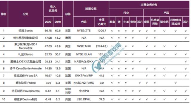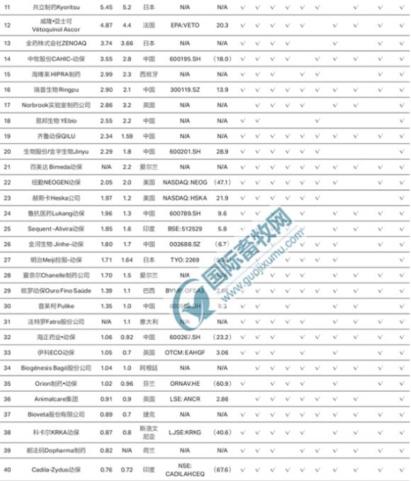 十家中國企業(yè)入圍,分別為:中牧股份(2020年收入為3.55億美元)、瑞普生物(2020年收入為2.90億美元)、易邦生物(2020年收入為2.55億美元)、齊魯動(dòng)保(2020年收入為2.34億美元)、金宇生物(2020年收入為2.29億美元)、魯抗醫(yī)藥(2020年收入為1.96億美元)、金河生物(2020年收入為1.80億美元)、普萊柯(2020年收入為1.35億美元)、海正藥業(yè)(2020年收入為1.06億美元)、永順生物(2020年收入為0.483億美元)。這10家企業(yè)2020年收入總計(jì)20.29億美元。根據(jù)中國獸藥協(xié)會(huì)公布的數(shù)據(jù),2020年國內(nèi)獸藥產(chǎn)品銷售規(guī)模為620.95億元。粗略估計(jì),中國動(dòng)保前十企業(yè)收入約占全國獸藥產(chǎn)品收入20.83%。