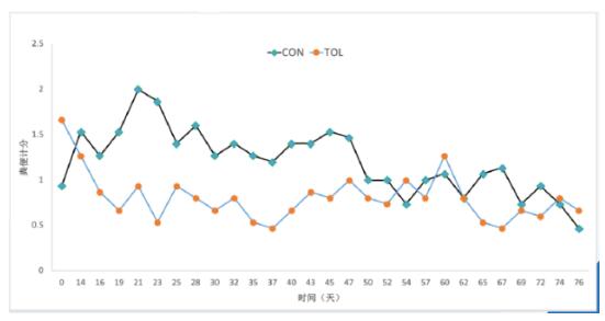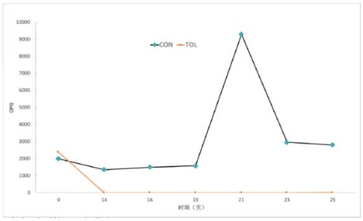 2022年8月-11月,禮藍(lán)動(dòng)保在國(guó)內(nèi)某集團(tuán)牧場(chǎng)選取了30頭剛斷奶犢牛,隨機(jī)分為 2 組,每組15頭,一組口服托曲珠利(15mg/kg),一組不給藥(對(duì)照組),然后檢測(cè) OPG、記錄腹瀉評(píng)分和增重,試驗(yàn)周期76天。
