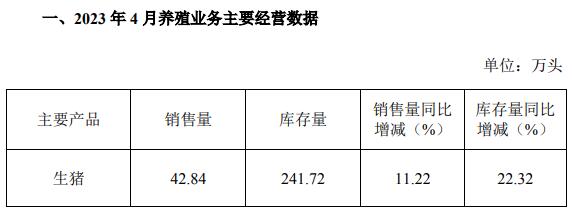 2023年1-4月,公司累計銷售生豬181.44萬頭,銷售量同比增長26.70%。