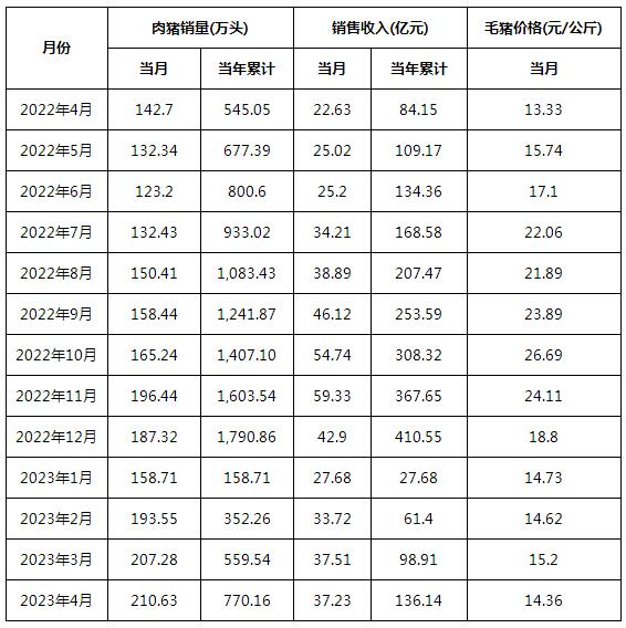 2、2023年4月,公司肉豬銷售收入同比上升,主要是肉豬銷量和銷售價(jià)格同比上升所致。