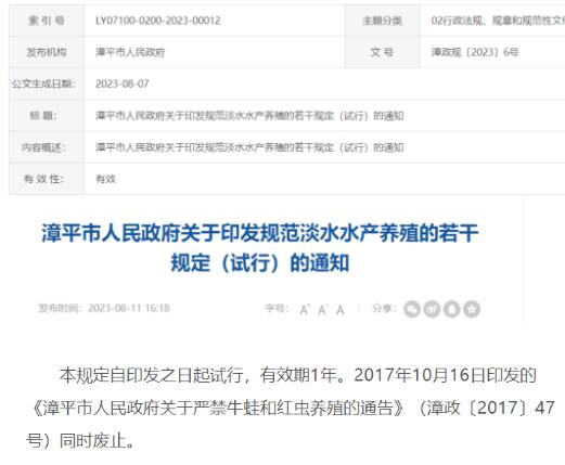 8月11日,福建漳平市人民政府關(guān)于印發(fā)規(guī)范淡水水產(chǎn)養(yǎng)殖的若干規(guī)定(試行)的通知發(fā)布了,同時2017年10月16日印發(fā)的《漳平市人民政府關(guān)于嚴禁牛蛙和紅蟲養(yǎng)殖的通告》(漳政〔2017〕47號)同時廢止。