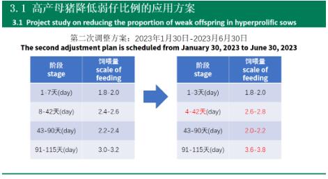 2023年9月-1月進(jìn)行了第一次飼喂方案調(diào)整:母妊娠后期91天-115天,增加料量0.6kg/頭/天,試驗結(jié)果顯示窩均弱仔下降0.5頭,發(fā)現(xiàn)沒有完全解決母豬產(chǎn)弱仔問題。