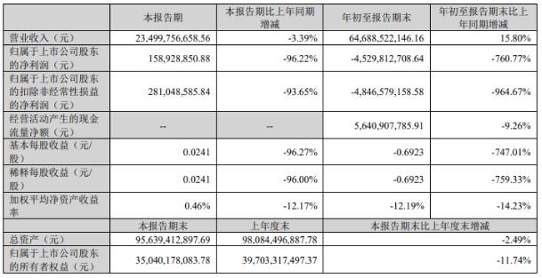 溫氏股份10月25日公布2023年三季度報告。前三季度公司實現(xiàn)營業(yè)收入646.89億元,同比增長15.8%;歸母凈利潤虧損45.3億元,同比下降760.77%。其中,第三季度公司實現(xiàn)營業(yè)收入235億元,同比下降3.39%;歸母凈利潤1.59億元,同比下降96.22%。