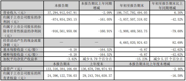 其中,第三季公司營業(yè)收入372.95億元,同比下降2.09%;歸母凈利潤-8.75億元,同比下降161.05%。