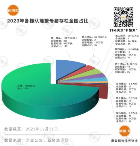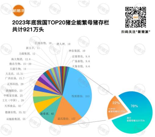 根據(jù)新豬派統(tǒng)計,截至2023年底,我國TOP20豬企能繁母豬共計921萬頭,占全國總量的22%。能繁母豬超過10萬頭的企業(yè)維持在23家。