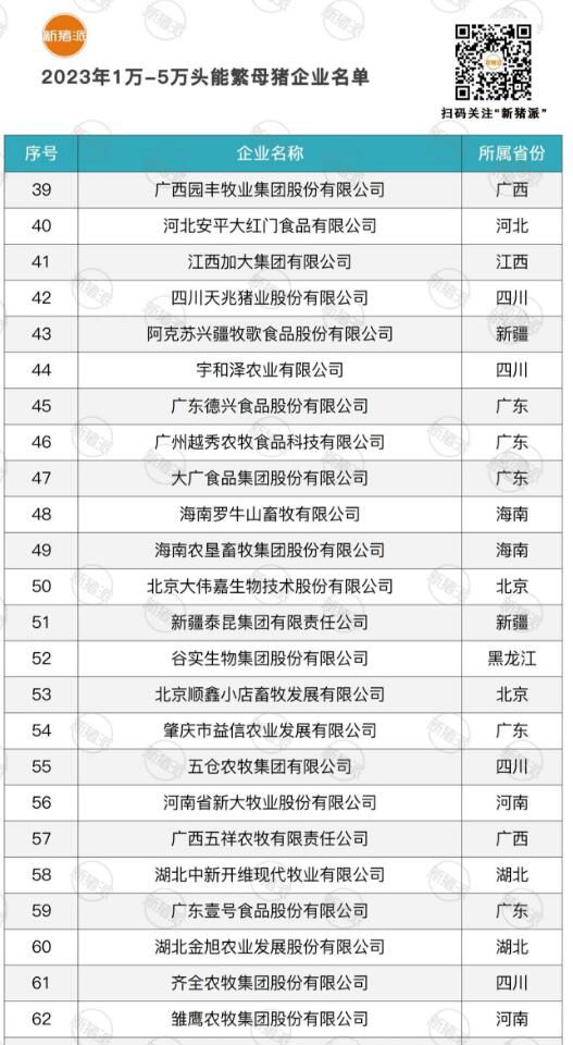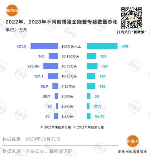 根據(jù)新豬派統(tǒng)計,截至2023年底,全國擁有1萬頭以上能繁母豬的企業(yè)共計118家,較2022年底減少2家。企業(yè)數(shù)量減少的同時,萬頭豬企能繁母豬共計1155萬頭,亦較2022年底的1176萬頭下降2%,占全國總量的28%。