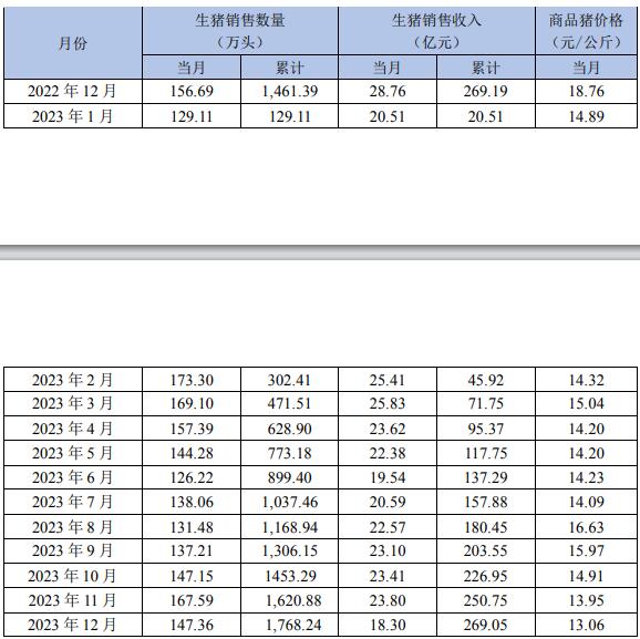 新希望1月9日公布2023年12月生豬銷售情況簡報(bào)。公司2023年12月銷售生豬147.36萬頭,環(huán)比變動-12.07%,同比變動-5.95%;收入為18.30億元,環(huán)比變動-23.11%,同比變動-36.37%;商品豬銷售均價(jià)13.06元/公斤,環(huán)比變動-6.38%,同比變動-30.38%。