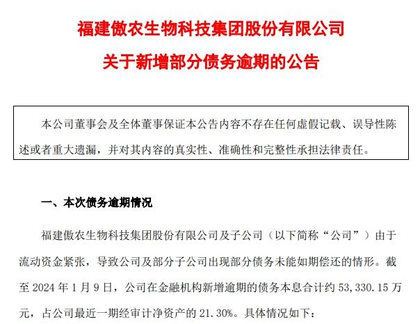 繼1月9日首次披露債務(wù)逾期后,1月12日,傲農(nóng)生物發(fā)布新增逾期債務(wù),截至2024年1月9日,傲農(nóng)生物在金融機(jī)構(gòu)新增逾期的債務(wù)本息合計約5.33億元,累計逾期債務(wù)本息合計約8.85億元(扣除已償還部分)。