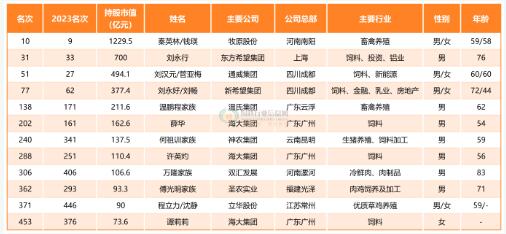 在農(nóng)牧行業(yè)里,共有12位企業(yè)家上榜,牧原秦英林、錢瑛夫婦位列榜單第10位,也是農(nóng)牧行業(yè)里唯一一家持股市值超千億的企業(yè)。此外,還有東方希望集團(tuán)、通威集團(tuán)、新希望集團(tuán)、溫氏集團(tuán)、海大集團(tuán)、神農(nóng)集團(tuán)、雙匯發(fā)展、圣農(nóng)實(shí)業(yè)、立華股份榮登榜單。海大集團(tuán)共有薛華、許英灼、譚莉莉三位高管上榜。