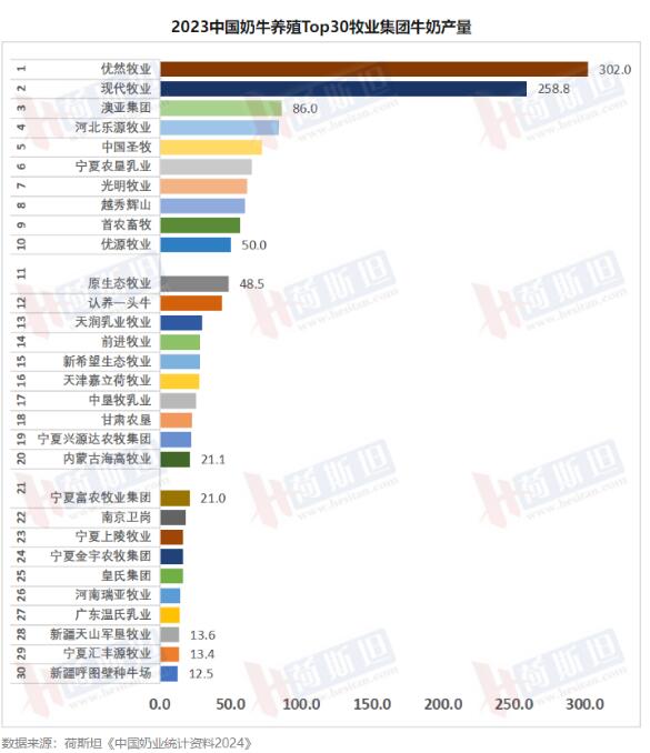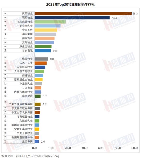 據(jù)荷斯坦編制的《中國奶業(yè)統(tǒng)計資料2024》數(shù)據(jù)顯示,2023年,Top30牧業(yè)集團年產(chǎn)奶量1549萬噸,占全國商品奶產(chǎn)量已超過一半,占51%,存欄奶牛292萬頭,占全國荷斯坦牛存欄的45%,其中成母牛存欄140萬頭,約占2023年全國荷斯坦成母牛存欄的40%。